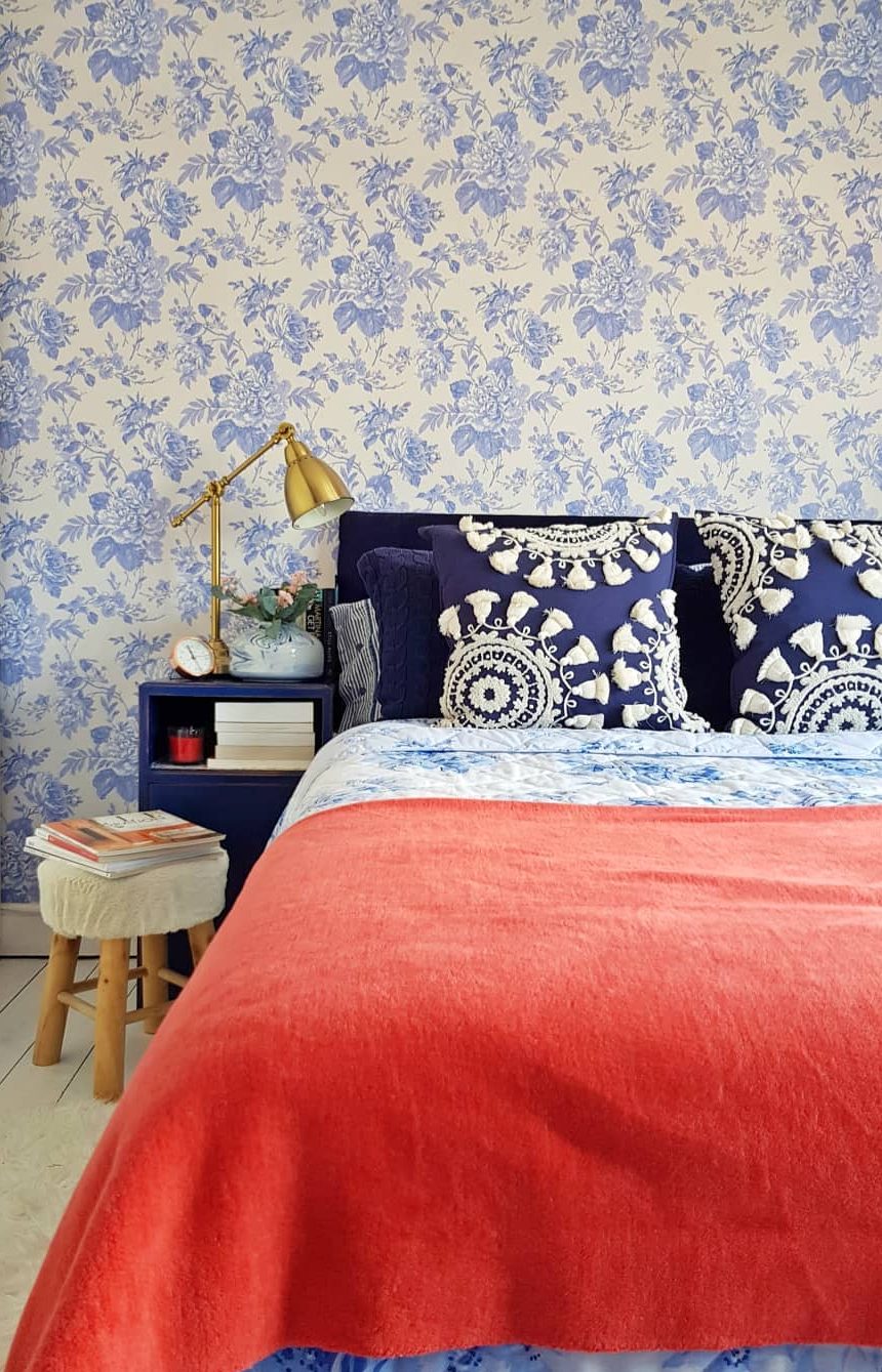 In a pre-war apartment in New York, a rich sapphire wall emphasizes the expansive nature of a relatively small master. The butterflies of Osborne and Little (visible on the lampshades and the chair) inspired all the colors of the bedroom. The fabric head part of Schumacher fabrics is flanked by hand-painted Korean antique chests. The sofa at the end of the bed is covered with vintage and custom fabric.